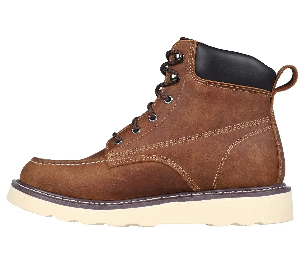 Classic leather work boot style comes to the job site in Skechers Work™: Kadmiel – Bennot. This lace-up work boot features a leather upper with a synthetic padded collar, a cushioned Air-Cooled Memory Foam® insole, and a durable Goodyear welt midsole.