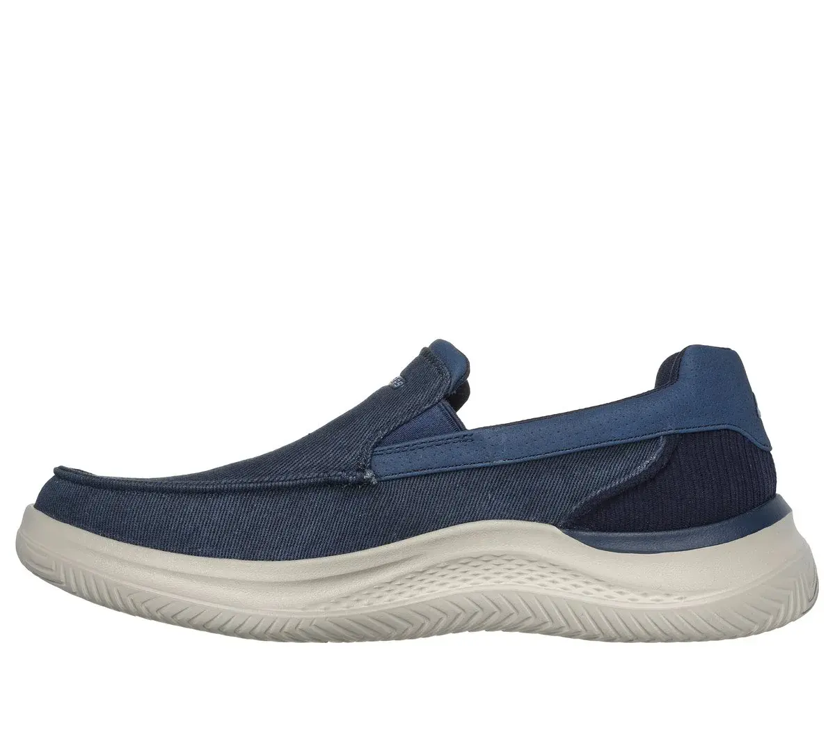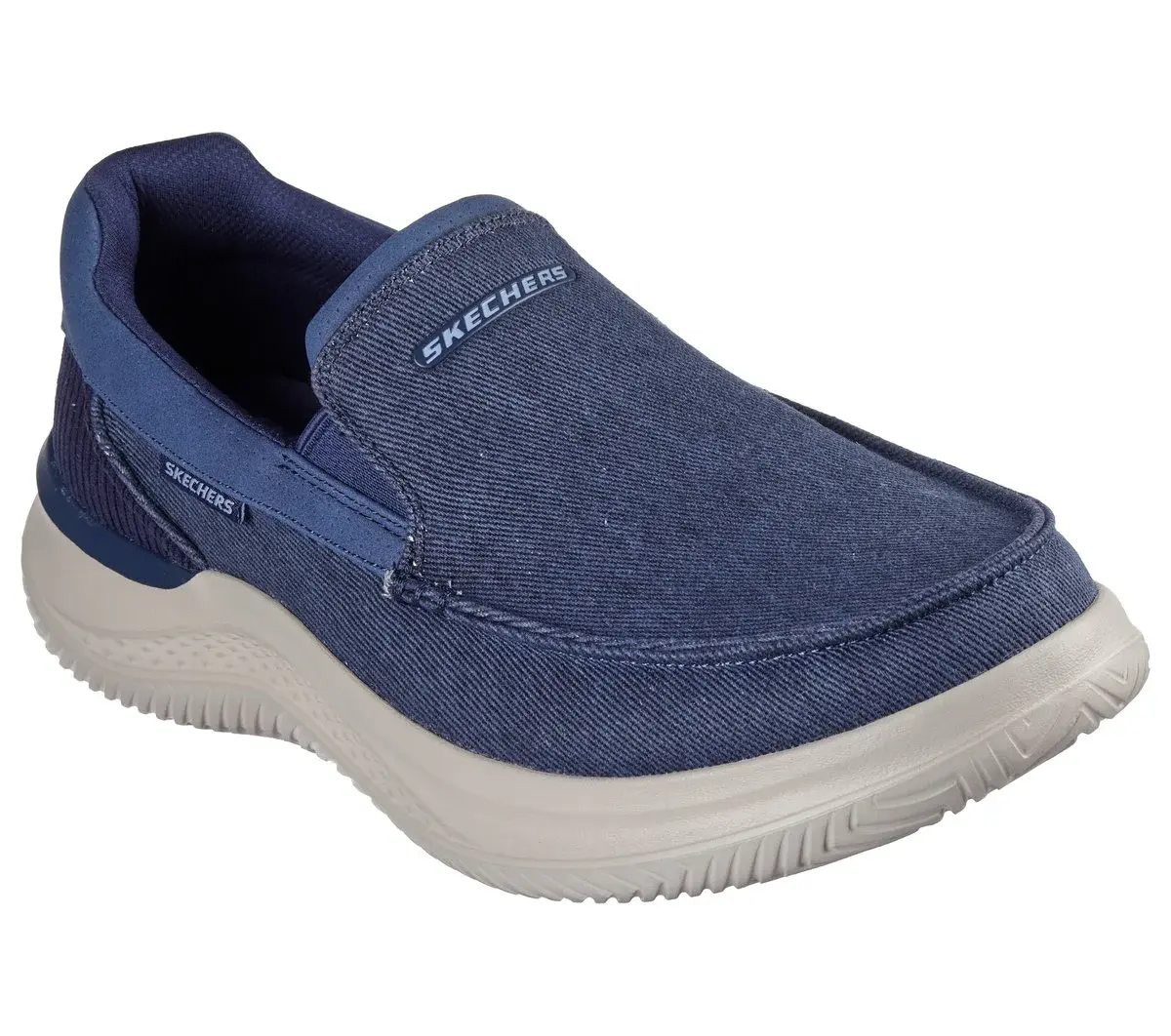 Experience casual comfort for your daily life wearing Skechers Relaxed Fit®: Hasting – Fielden. This vegan moc toe loafer features a roomy canvas and synthetic trimmed upper with twin gore panels for ease of wear and a cushioned Air-Cooled Memory Foam® insole.