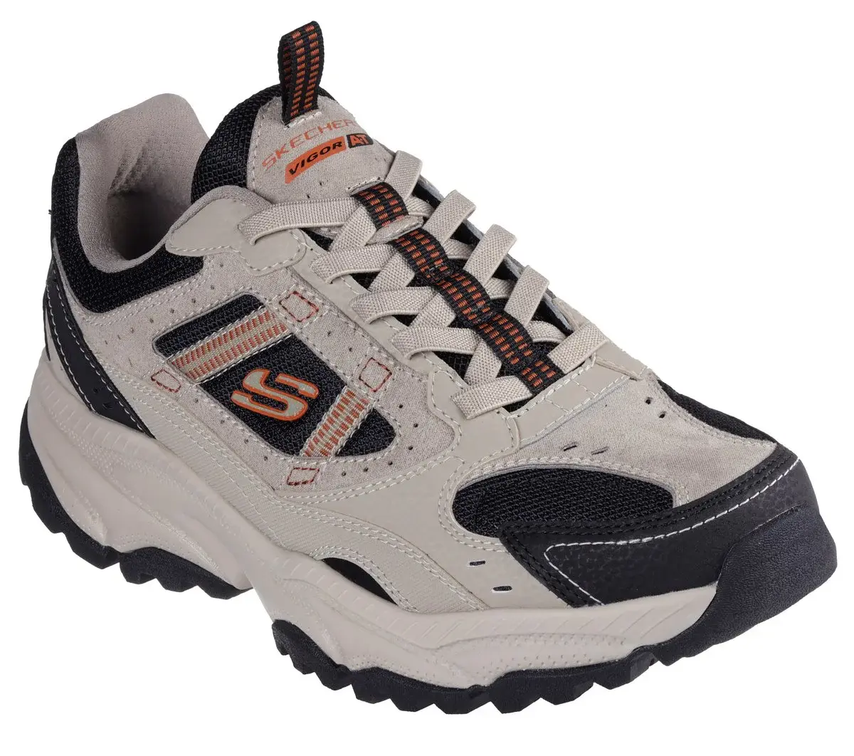 Reach to new heights of comfort in Skechers Vigor AT – Three Corners. This outdoor trail design features a suede and synthetic upper with stretch laces and a cushioned Skechers Air-Cooled Memory Foam® comfort insole.