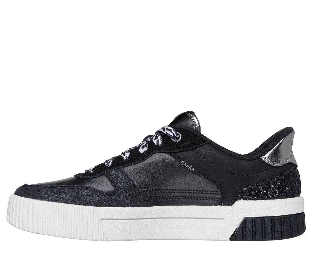 Effortlessly show off your glamorous safari side with Skechers Hands Free Slip-ins®: Jade – Radiant Roar. Designed with our exclusive Heel Pillow™, this court-style fashion sneaker features a duraleather and suede upper with animal print laces, a glittered heel panel, metallic accents, and a cushioned Skechers Air-Cooled Memory Foam® insole.
