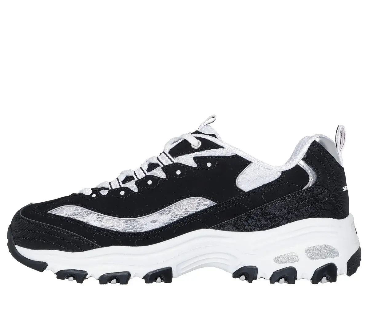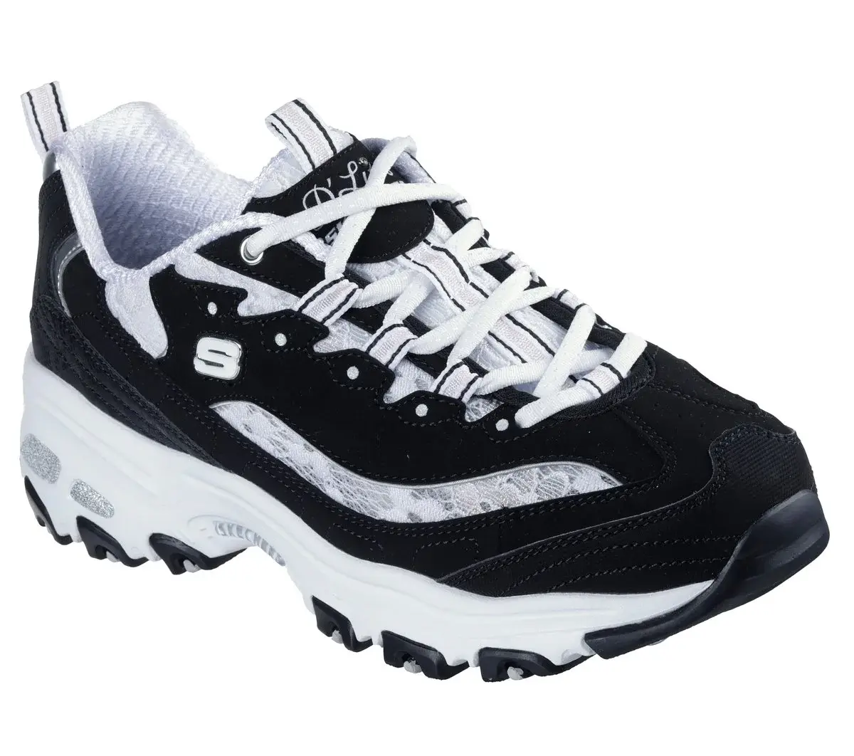 An iconic style is reimagined with romantic details and classic comfort in Skechers D’Lites® – Sunlit Garden. This lace-up fashion style features a synthetic upper with floral lace trim and cushioned Skechers Air-Cooled Memory Foam® insole.