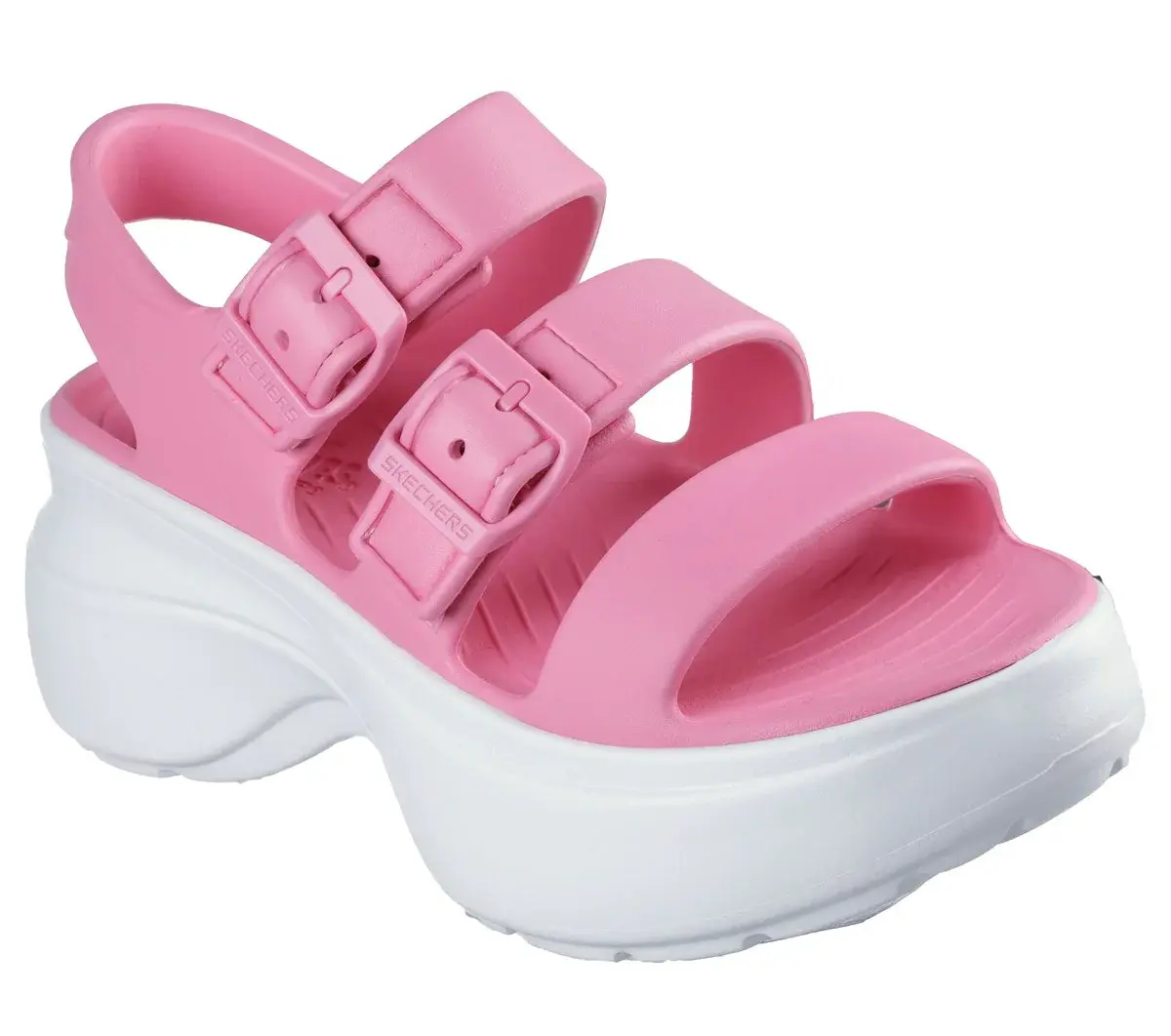 Make a statement with a fashion-forward look wearing Skechers Foamies®: Foamies Tai – Get Real. This sculpted open-toe fashion sandal features a flexible Foamies® EVA upper with buckle straps, adjustable instep closure, cushioned footbed, and a semi-articulated chunky midsole.