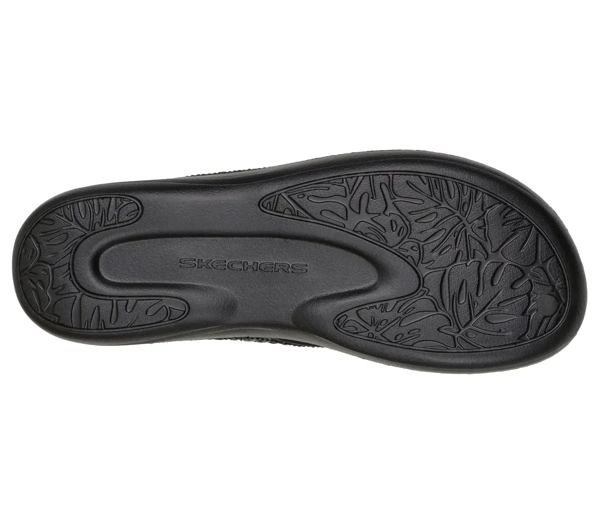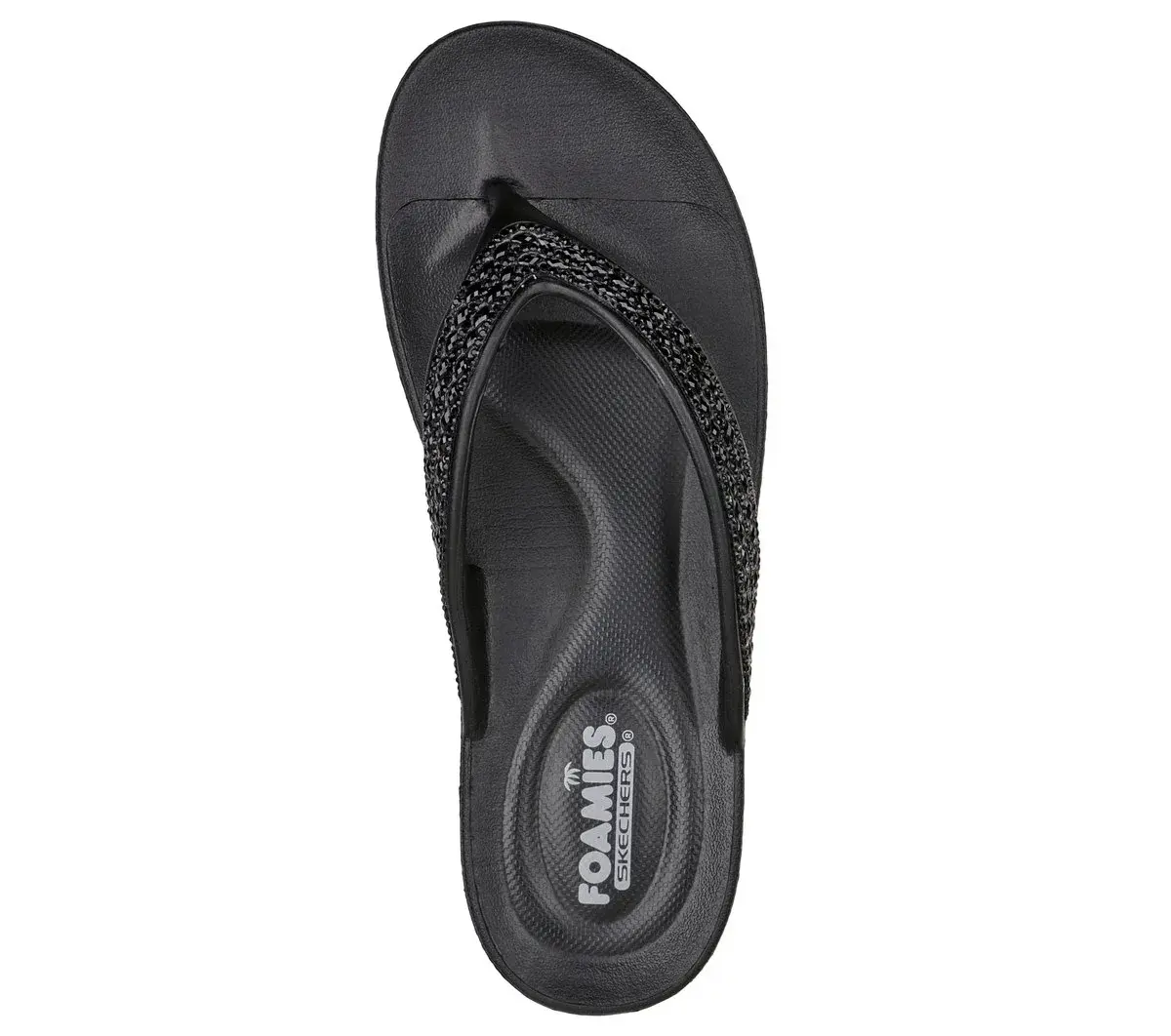 Sparkle up your summer style with Skechers Foamies®: Glitzy. This casual sculpted thong sandal features a flexible EVA upper with rhinestone embellishments, plus a contoured cushioned footbed.