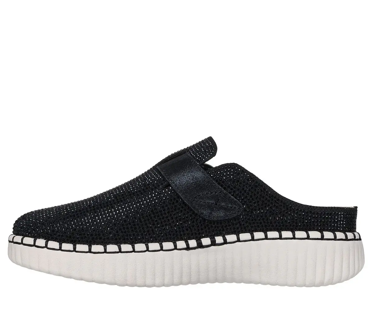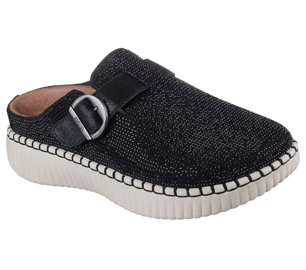 Celebrated lifestyle expert, Martha Stewart, delivers her one-of-a-kind touch to Skechers in this spirited collaboration. Ease into luxurious comfort that shines with Martha Stewart x Skechers: Arch Fit® Topangah. This open-back comfort clog features a rhinestone-embellished woven upper with a buckled instep strap , a supportive Arch Fit® footbed with contoured Luxe Foam®.