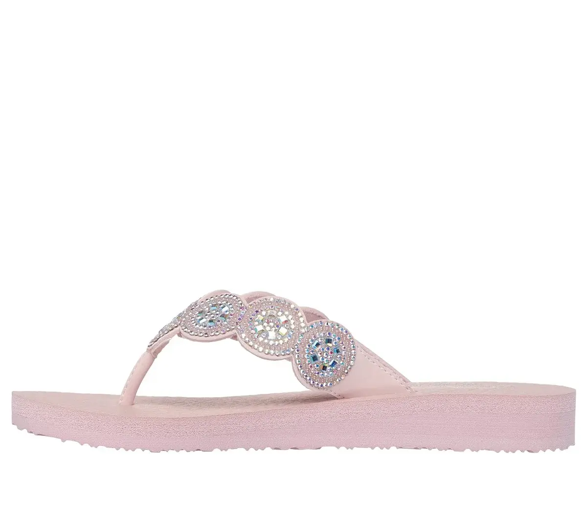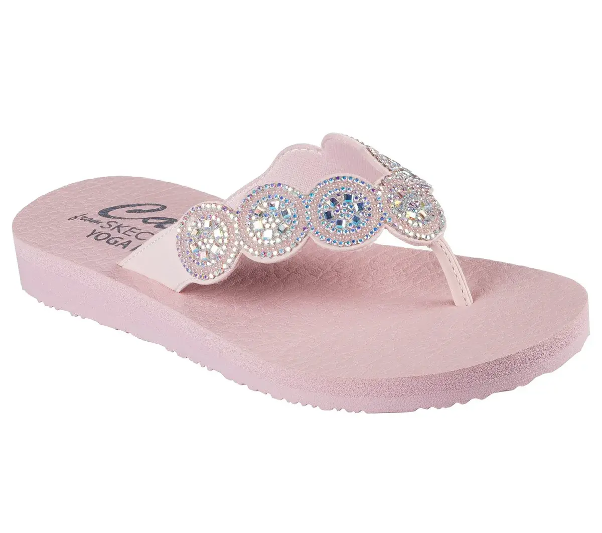 Glam up in style this season wearing Skechers Cali® Meditation – Alluring Image. This casual vegan thong sandal features a synthetic upper with rhinestone embellishments and a cushioned Yoga Foam® comfort footbed.