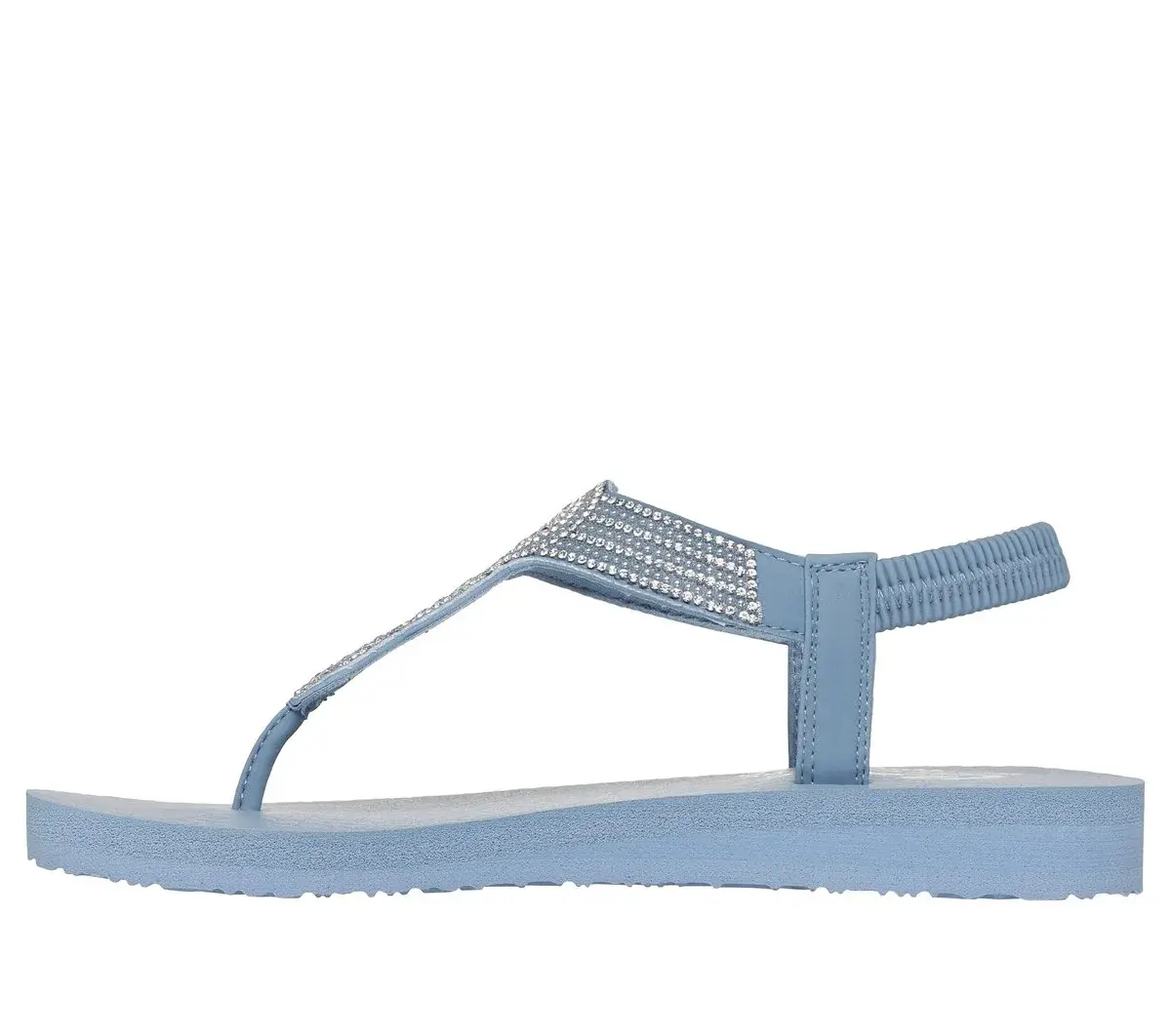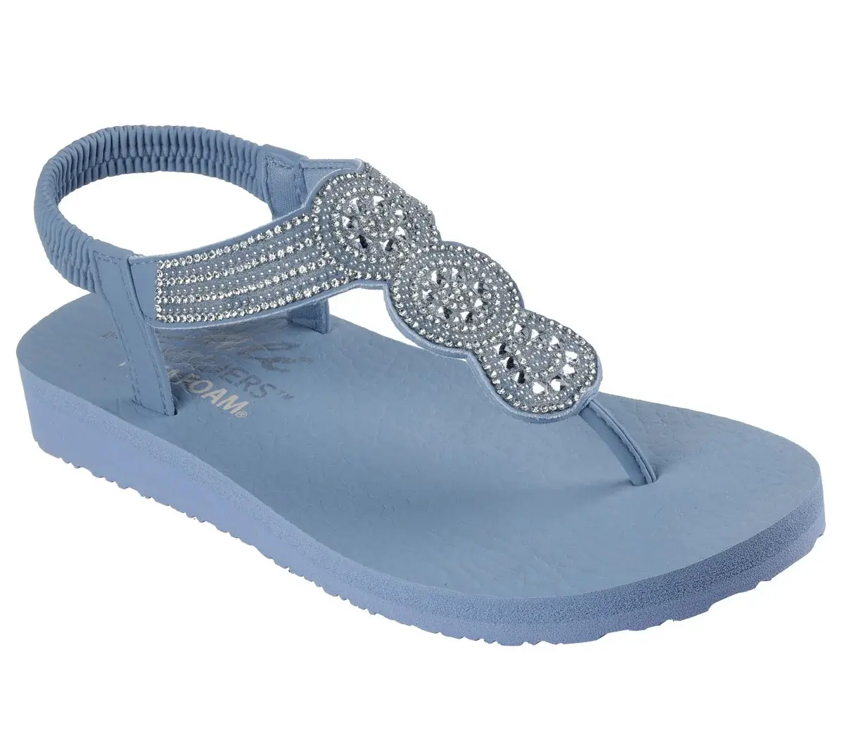 Sparkle in the sunshine with easygoing comfort wearing Skechers Cali® Meditation – Sweet Desire. This casual thong sandal features a rhinestone embellished synthetic upper with stretchable sling-back strap and a cushioned Yoga Foam® comfort footbed.
