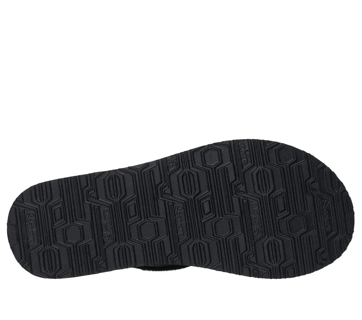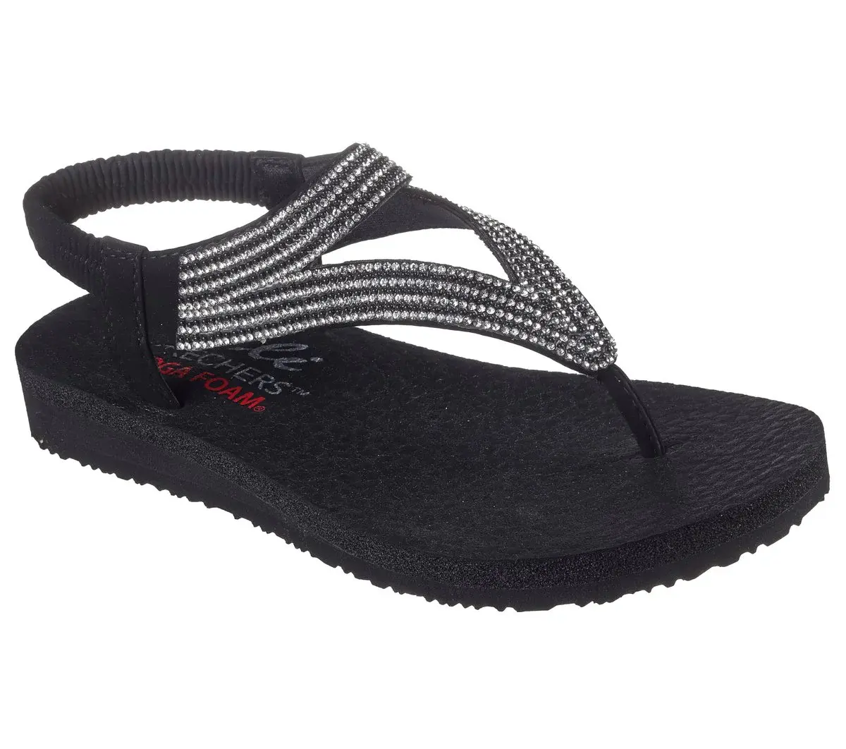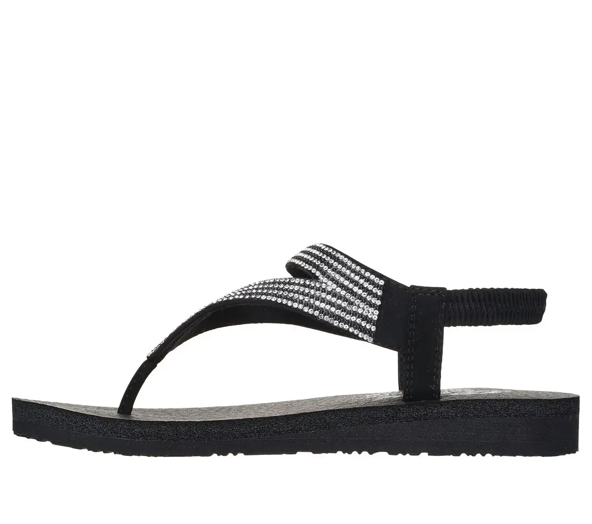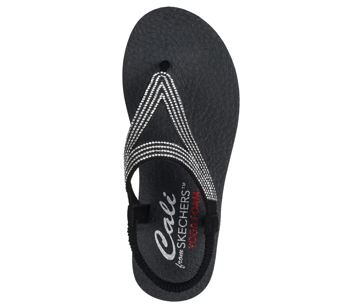 Sparkle in the sunshine with easygoing comfort wearing Skechers Cali® Meditation – Vibrant Glow. This casual thong sandal features a rhinestone embellished synthetic upper with stretchable sling-back strap and a cushioned Yoga Foam® comfort footbed.