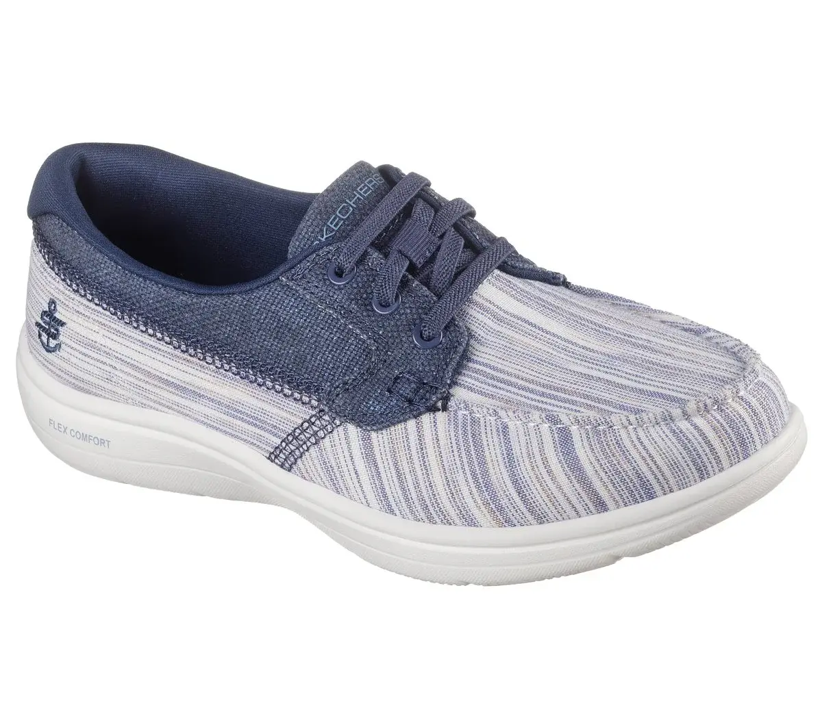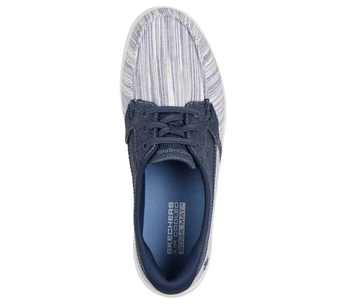 Get on board with the stylish comfort of Skechers On-the-GO® Flex Radiant – Malia. This casual vegan boat style features a metallic canvas upper with fixed stretch laces, high-rebound Skechers Air-Cooled Goga Mat™ insole, and lightweight ULTRA GO® cushioning.