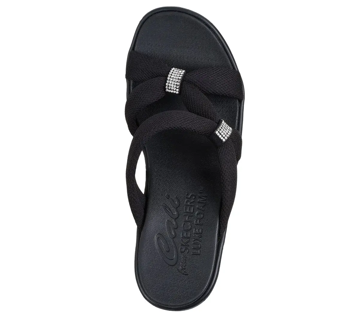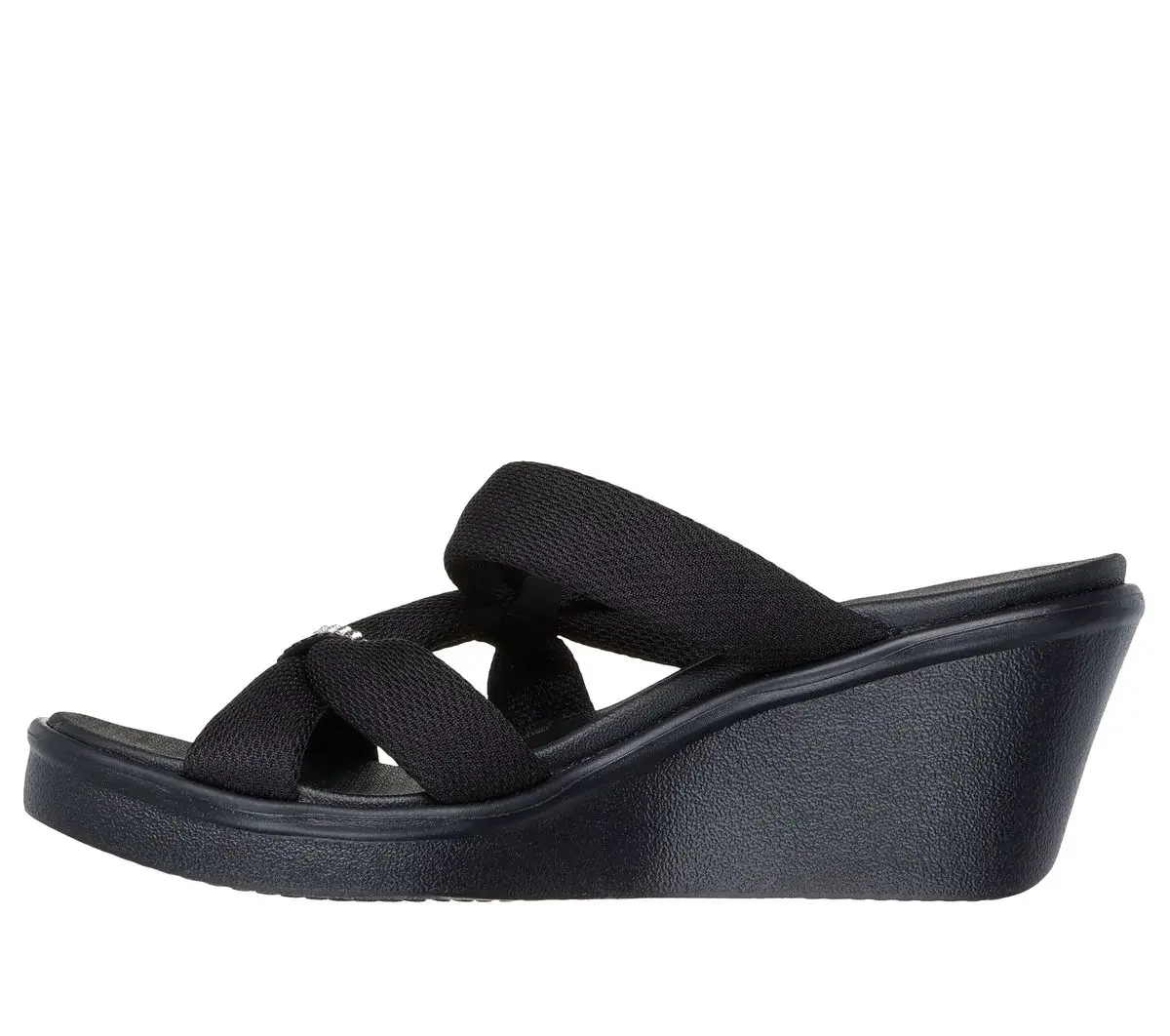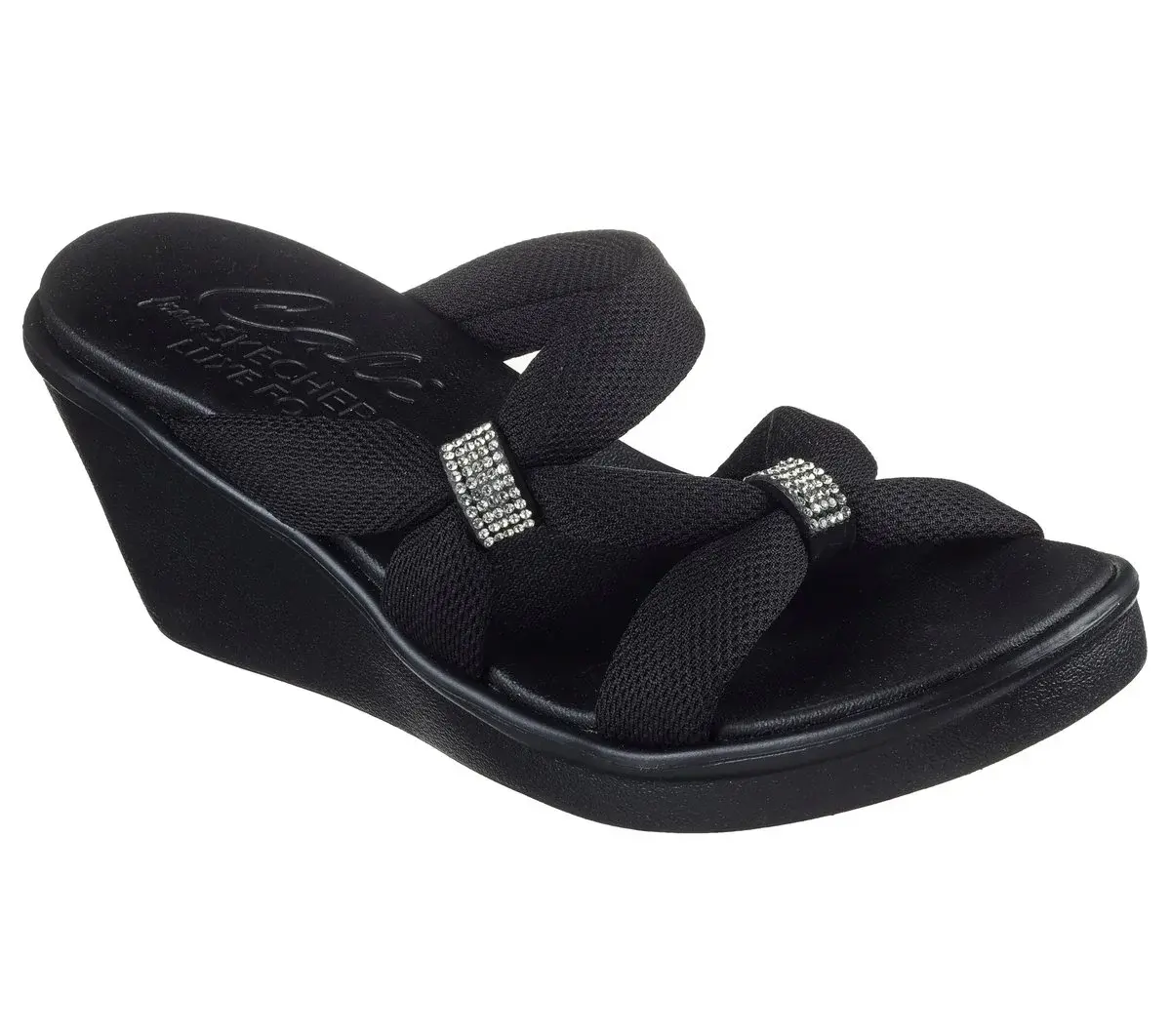 Glam style comfort and looks combine in Skechers Cali® Rumble On – High Class. This wedge sandal features a woven strap upper with a rhinestone embellished bow and a cushioned Luxe Foam® footbed.