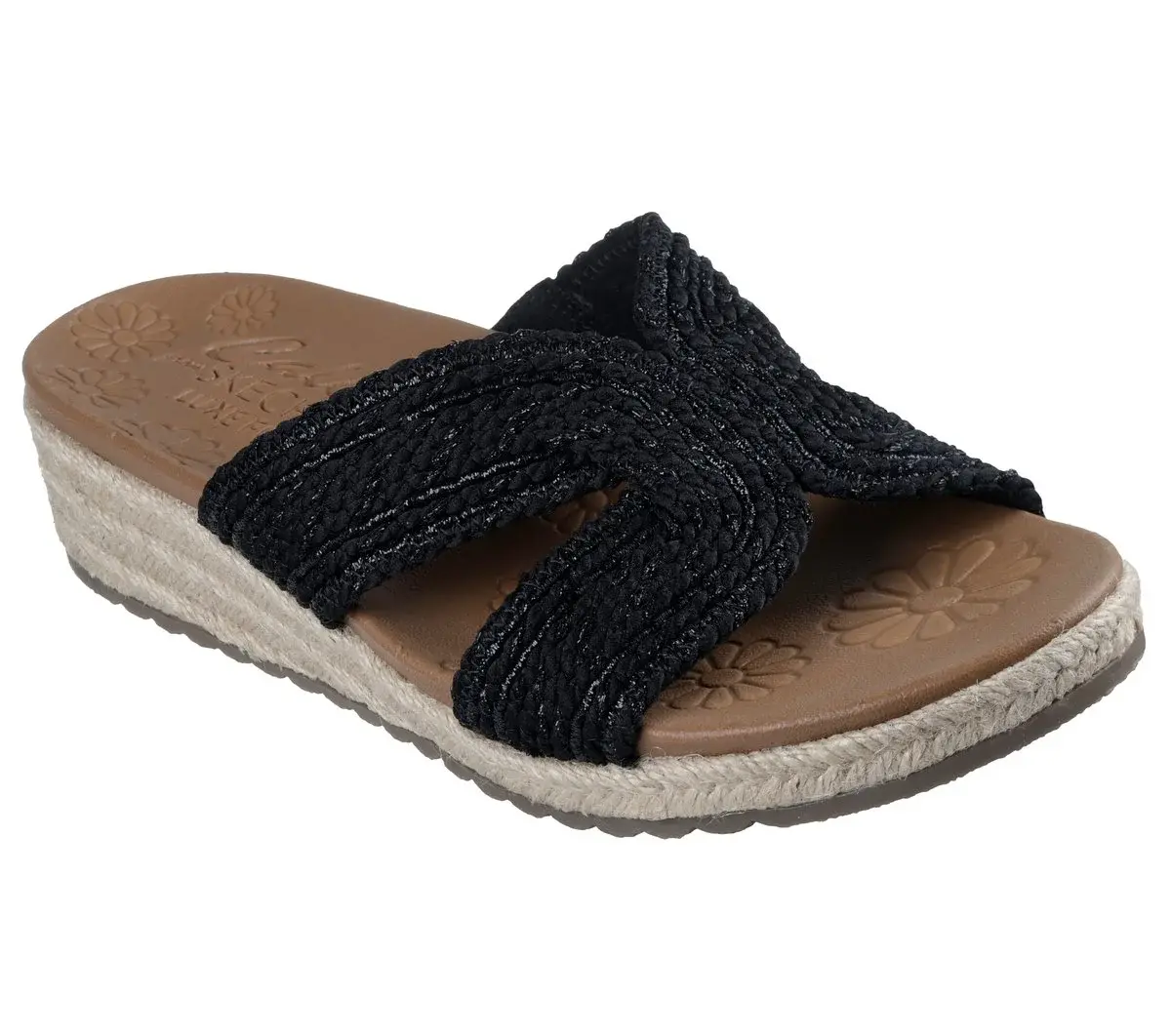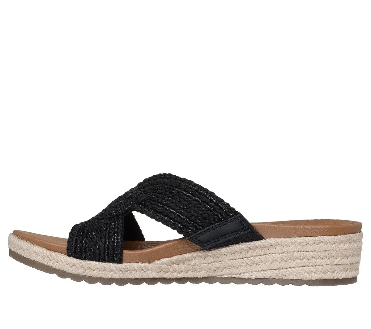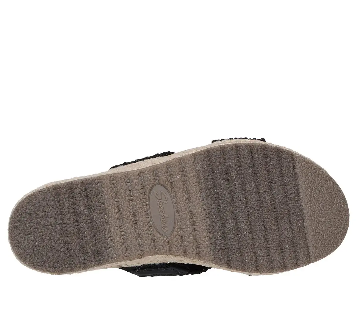 Summery style and top-notch comfort combine in Skechers Cali® Breezie – Shimmer Waves. This vegan wedge sandal features a metallic jute H-band upper, an espadrille midsole with jute trim, and a cushioned Luxe Foam® footbed.