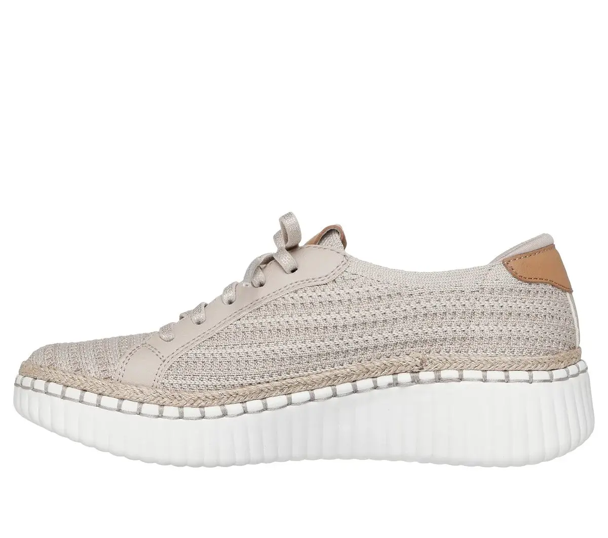 Take a walk on the stylish side in machine-washable comfort with Skechers Wilshire Blvd – Passion Play. This vegan Skechers No Tie Fit® design features a sweater knit upper with faux laces, jute midsole trim, a Comfort Pillow at the heel, and a cushioned Skechers Air-Cooled Memory Foam® insole.